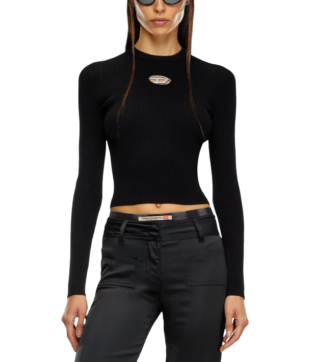 Cod: A15328 0DLAX 9XX Top da donna in morbida maglia a coste in un filato misto che comprende viscosa da foreste gestite responsabilmente. Il modello ha una vestibilità aderente, con scollo rotondo e maniche lunghe. La placca Oval D in metallo intarsiata sul petto aggiunge una nota distintiva alla silhouette minimale. Composizione: 83%Viscosa 17%Poliestere Slim fit Colore: Nero