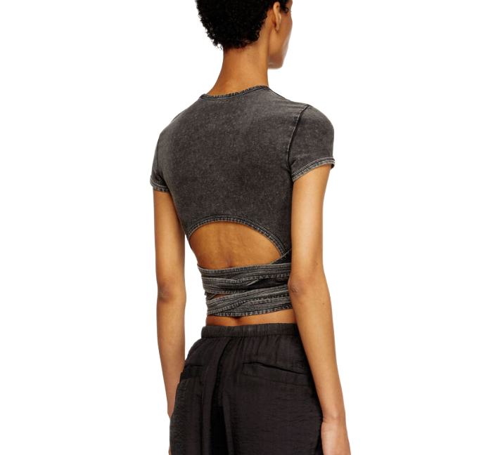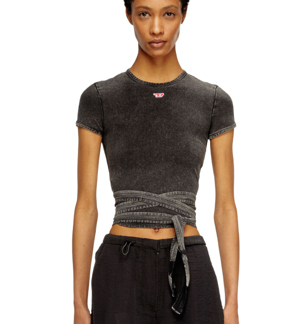 Cod. A19520 0KIBY 02A T-shirt da donna che avvolge il corpo, realizzata in jersey di cotone stretch, tinto e lavato per ricreare il look del denim indaco. La classica silhouette a maniche corte è reinventata con fasce da annodare intorno al corpo, creando un cut-out sulla schiena. Completata con una patch ricamata a forma di logo D. Composizione: 93%Cotone 7%Elastan Slim fit Lacci che si avvolgono intorno al corpo Colore: Nero effetto denim