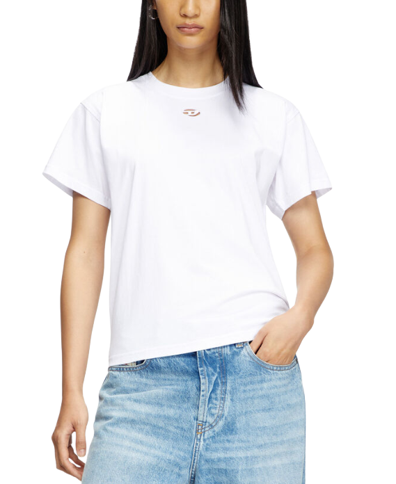 Cod. A17736 0NIAX 100 Realizzata in jersey di cotone biologico, questa T-shirt girocollo da donna presenta una silhouette regular con bordi a coste. Un piccolo logo Oval D cut-out al centro del petto aggiunge un dettaglio iconico. Composizione: 100%Cotone, Costina 95%Cotone 5%Elastan Regular fit