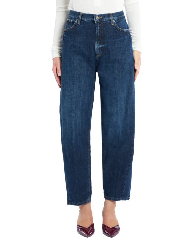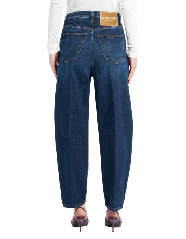Cod. DP784 DFE311D LL1 DD W25 800Jeans Bessie cinque tasche loose fit, vita alta. Denim fisso cross blu 12 1/2 oz. Lavaggio scuro pulito. Logo Dondup. Made in ItalyColore: BluMateriale: 100% Cotone
