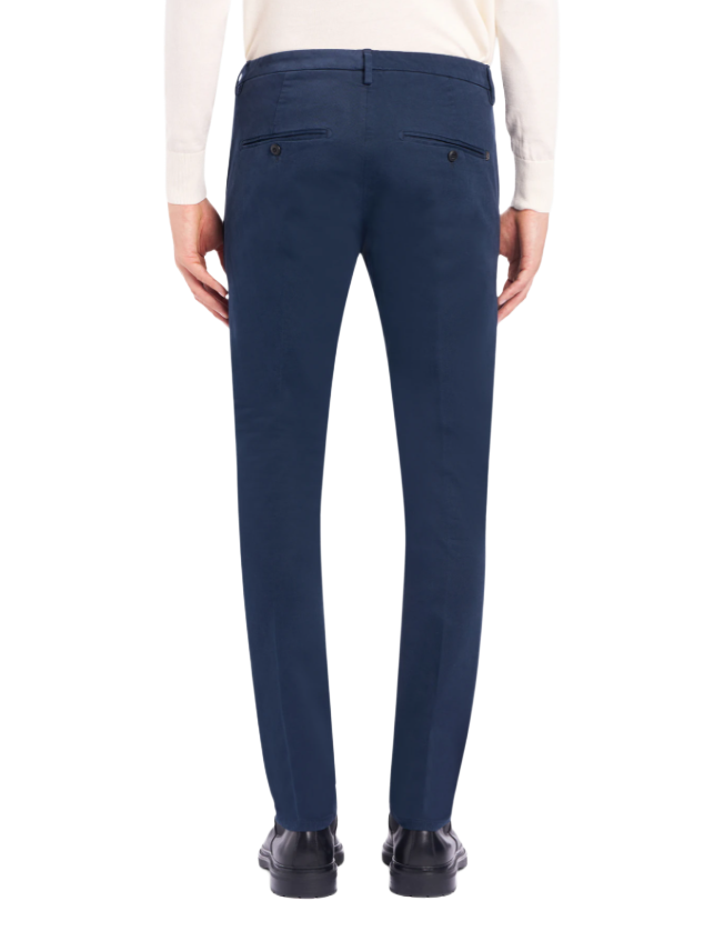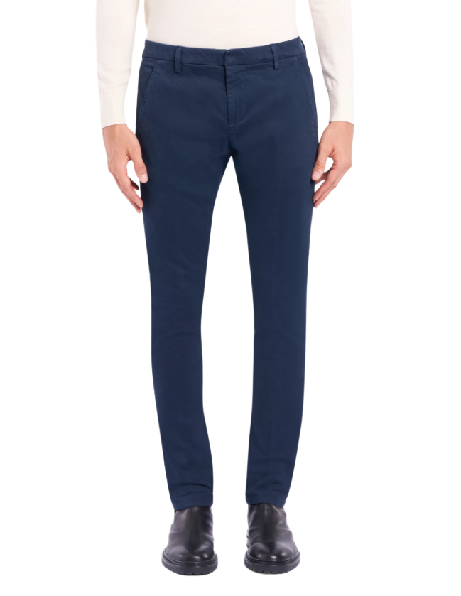 Cod. UP235 GSE043U PTD DU W25 899 Pantaloni Gaubert slim chino, vita bassa, tasche a filetto posteriori. Gabardina stretch mano calda. Tintura in capo. Logo Dondup. Made in Italy Colore: Blu Tuareg Materiale: 98% Cotone 2% Elastan