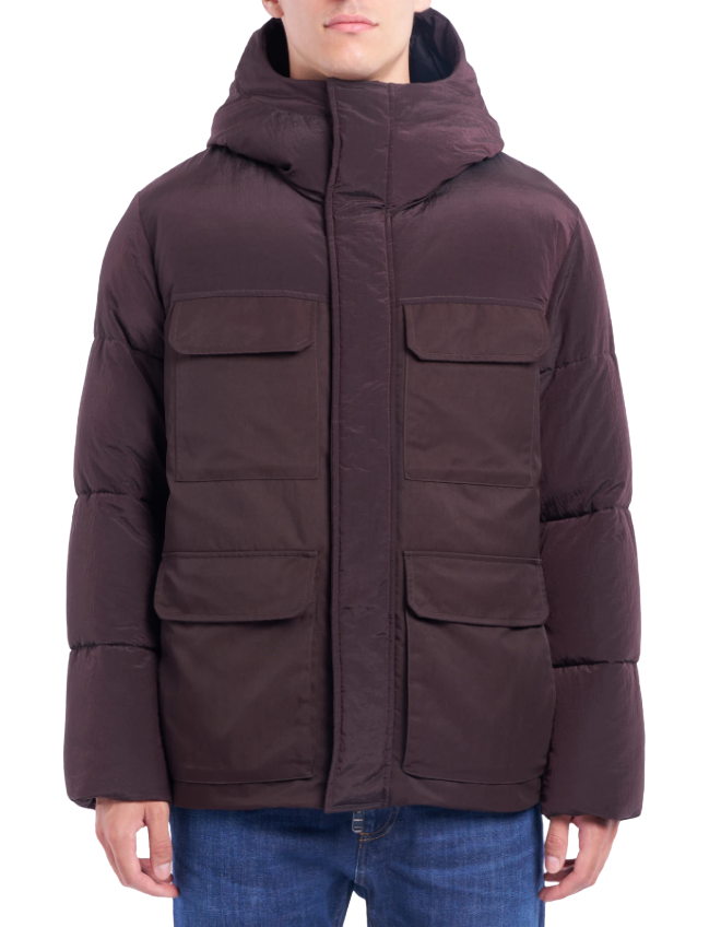 Cod. UJ969 PX0141M XXX DU W25 737 Puffy jacket regular con cappuccio, allacciatura con zip e bottoni nascosti, doppie tasche a toppa con pattine squadrate. Waled nylon. Logo Dondup. Made in Italy Materiale: 100% Poliammide Colore: Cioccolato
