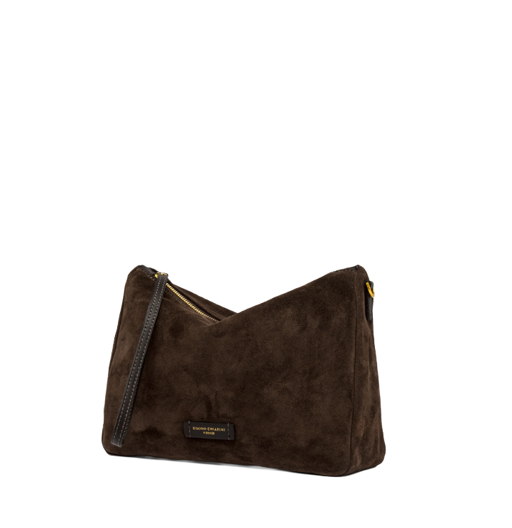 Cod. BS 10225 CM-PL 974 La borsa Nora Pouch by Gianni Chiarini Firenze è realizzata in morbida pelle scamosciata. È dotata di un cinturino in pelle che permette di portarla al polso e di una tracolla regolabile, entrambi removibili. Presenta una chiusura con zip per una maggiore praticità. Dimensioni: 28x21x9 cm. Colore: Moka