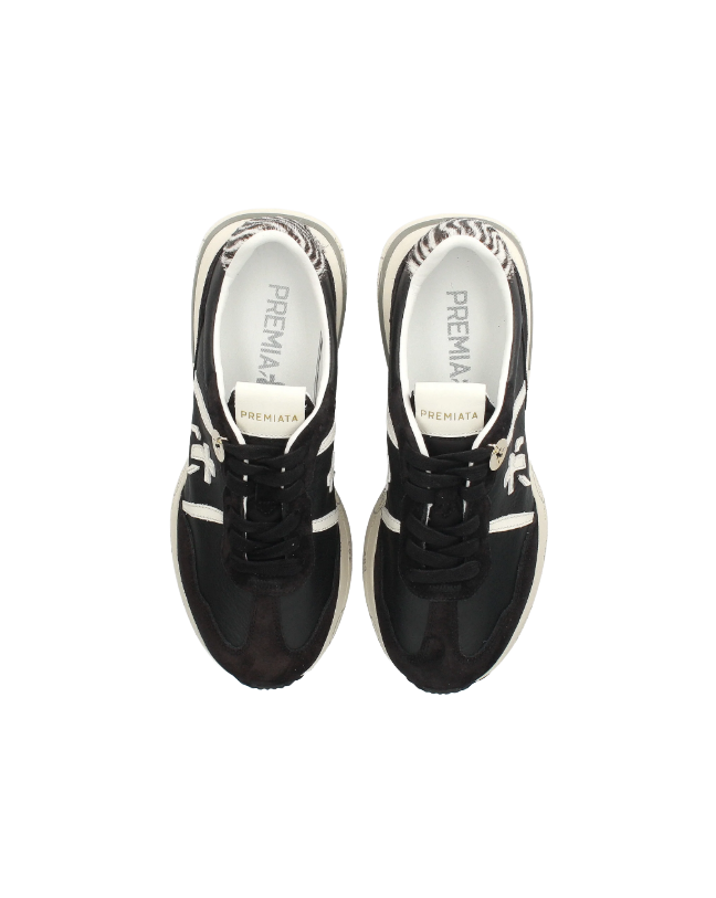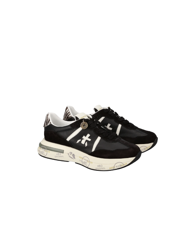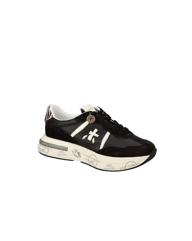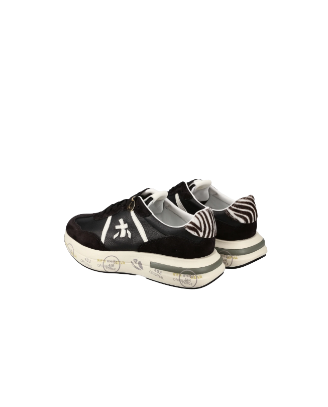 Sneaker Premiata bianca e nera con logo laterale, dettaglio zebrato sul tallone e suola con timbri del brand.