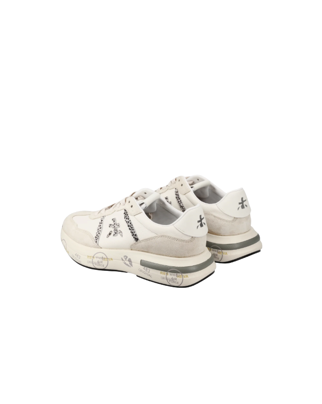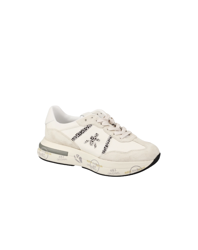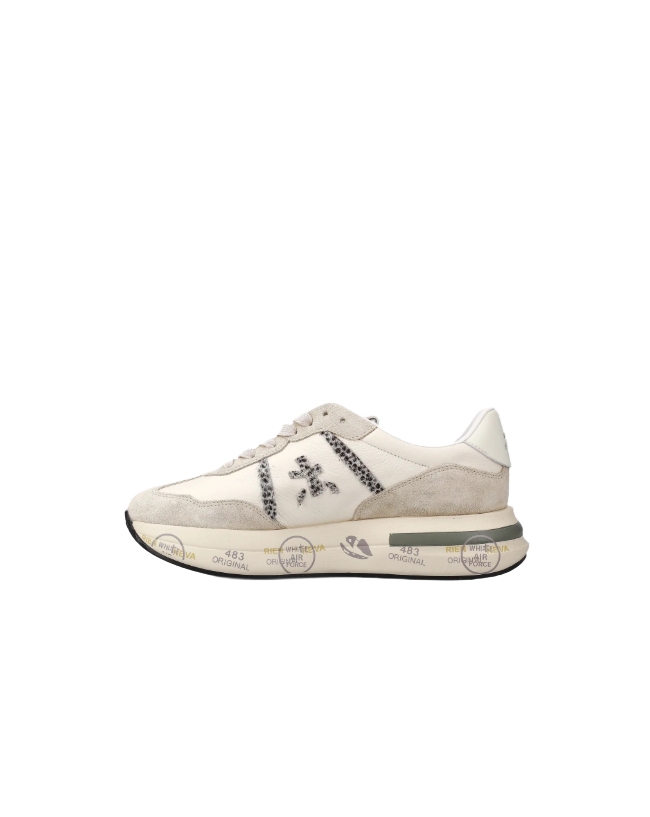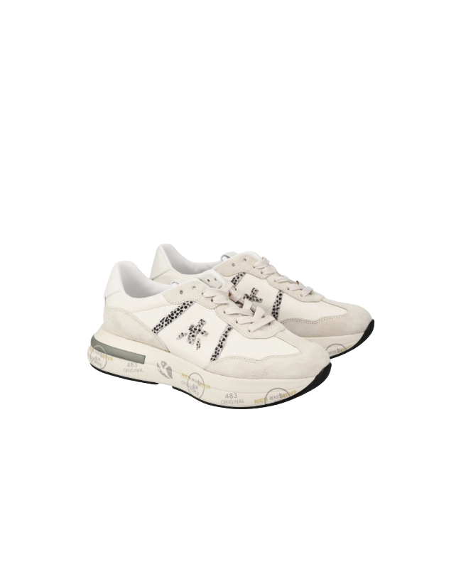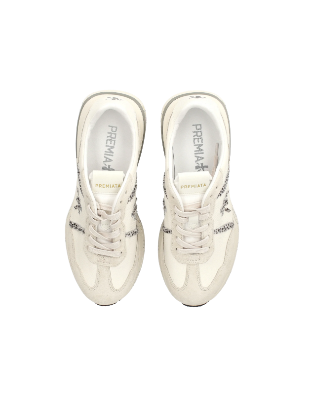 Sneaker Premiata in tonalità beige e off-white con tomaia in pelle scamosciata e tessuto. Logo laterale e suola con timbri distintivi del brand.