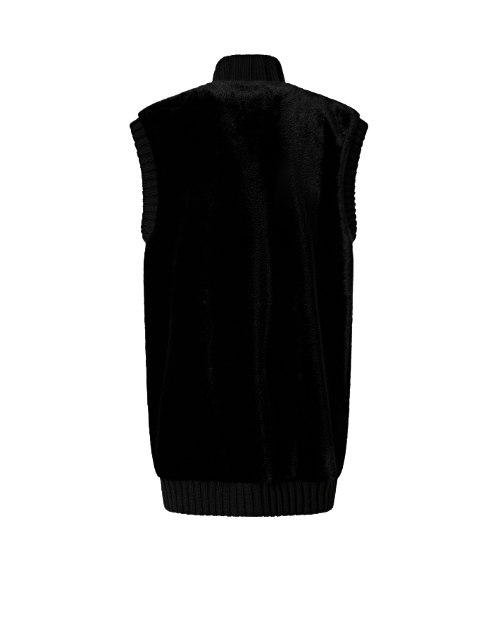 Gilet lungo dalla linea dritta caratterizzato da dettagli in costa di maglia in corrispondenza del collo montante, dell'apertura frontale nascosta e del giromanica.