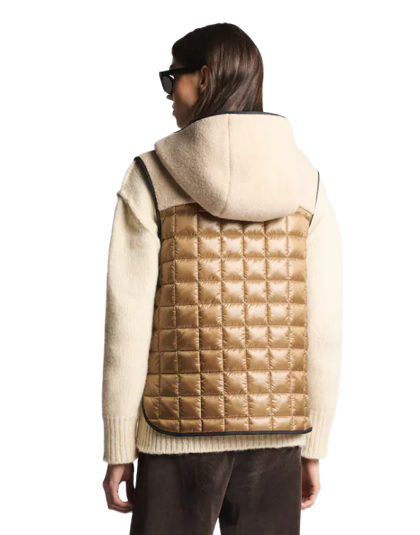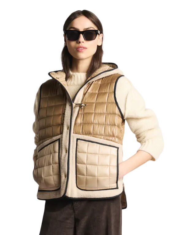 Cod. NAW20514040XOS310U Gilet realizzato in tessuto tecnico trapuntato a quadri con imbottitura in ovatta. Questo modello, caratterizzato da inserti e cappuccio in shearling, presenta tasche applicate in nylon trapuntato. Il capo è completato da una chiusura con automatici personalizzati e l'iconico gancio Fay all'altezza del petto. Made in Italy Fitting: regular Composizione capo: 100% poliammide, secondo tessuto 70% lana vergine, 30% poliestere, fodera 100% poliammide, imbottitura 100% poliestere, bordature 100% poliestere Colore: MARRONE, BEIGE
