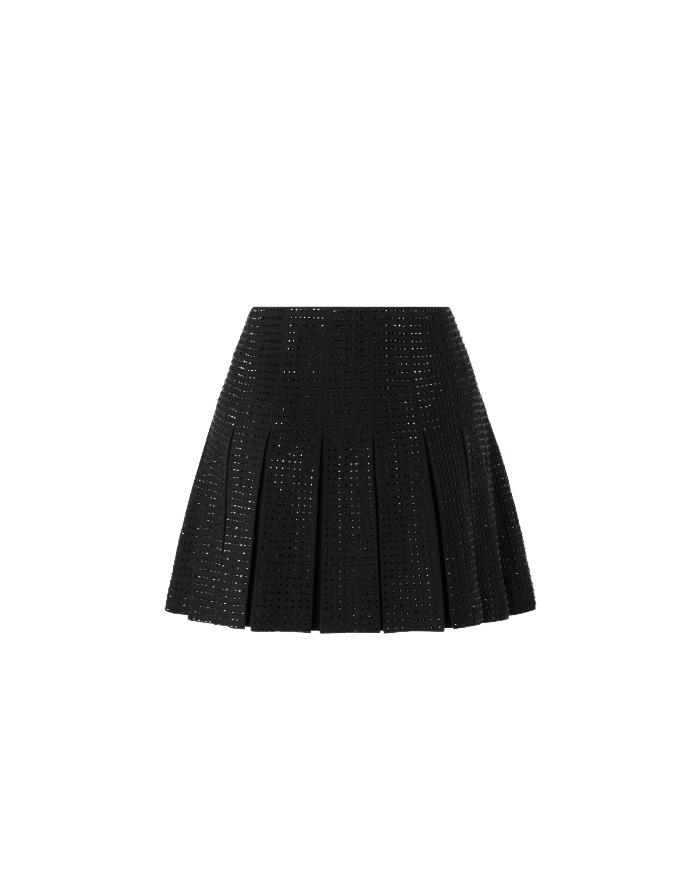 Minigonna dalla linea svasata scandita da pieghe ben definite che donano movimento al look.