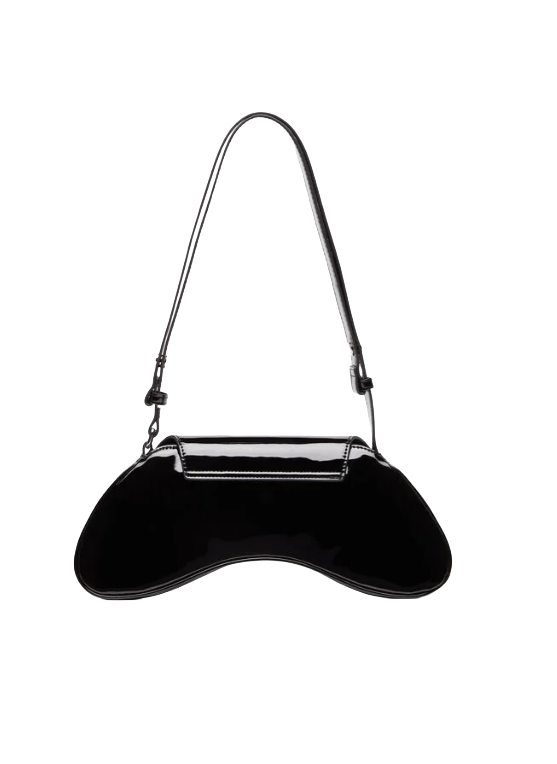 Questa borsa da donna ha una silhouette strutturata e compatta, ispirata ai classici joystick da videogame.