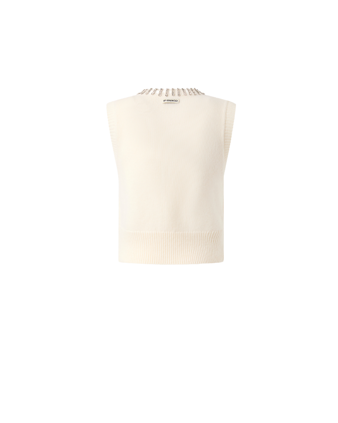 Cod. 105639 A2TR Z13 Gilet in maglia di misto lana con scollo a V, perfetto per le giornate in ufficio e non solo. L'orlo e il giromanica sono lavorati a coste, mentre il capo è completato dall'etichetta tono su tono con logo lettering PINKO sul retro. Il capo è stato sottoposto a prove di finissaggio per ridurre al minimo la possibile formazione di pilling, garantendo una maggiore morbidezza e durabilità del tessuto. Il design è immediatamente riconoscibile grazie agli strass di diverso tipo: ricamati con rigore sullo scollo, mentre sul resto del modello sono caratterizzati da diverse dimensioni e forme geometriche per un tocco inaspettato. Filato Esterno: LANA 80% NYLON 20% 1° Ricamo: Vetro 100% 2° Ricamo: ACCIAIO 100% Colore: Bianco