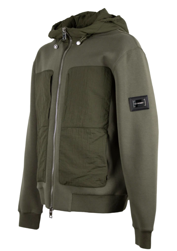 Cod. 252L02024 75000 Felpa / Giacca con chiusura con zip colore argento Cappuccio in nylon con coulisse Tasche in nylon con zip a scomparsa Elastico su polsini e fondo Composizione: 82% cotone 13% poliestere 5% elastan Cappuccio e tasche composizione: 100% Nylon Colore: Verdone
